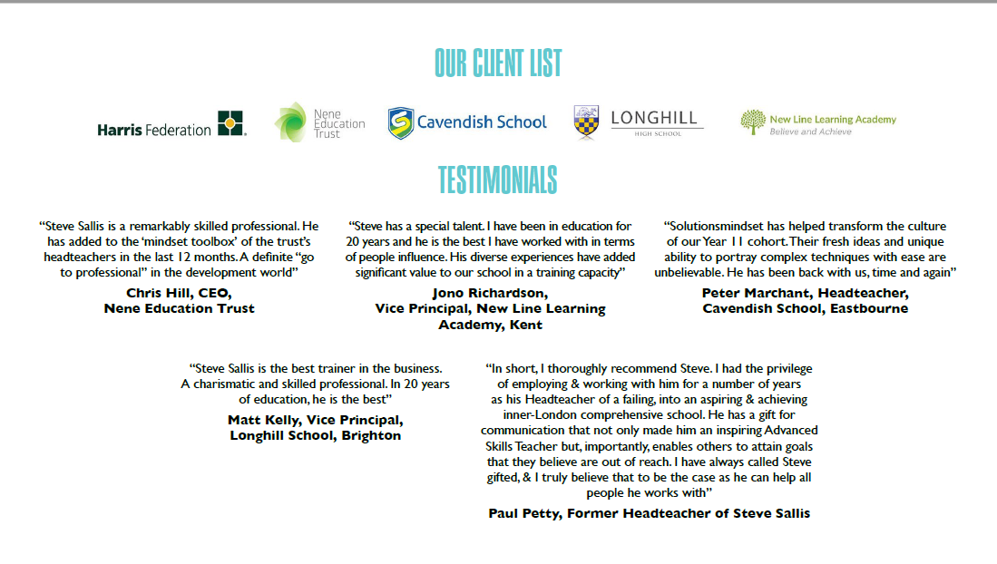 ““Steve Sallis’ is simply an expert practitioner. An innovator in the sport psychology, education, training and coaching sector. He has transformed the culture of teams and people around him. He does not claim to have all the answers but he will make you think differently and therefore have a sustained impact on your performance and outcomes. A seriously knowledgeable professional”.”